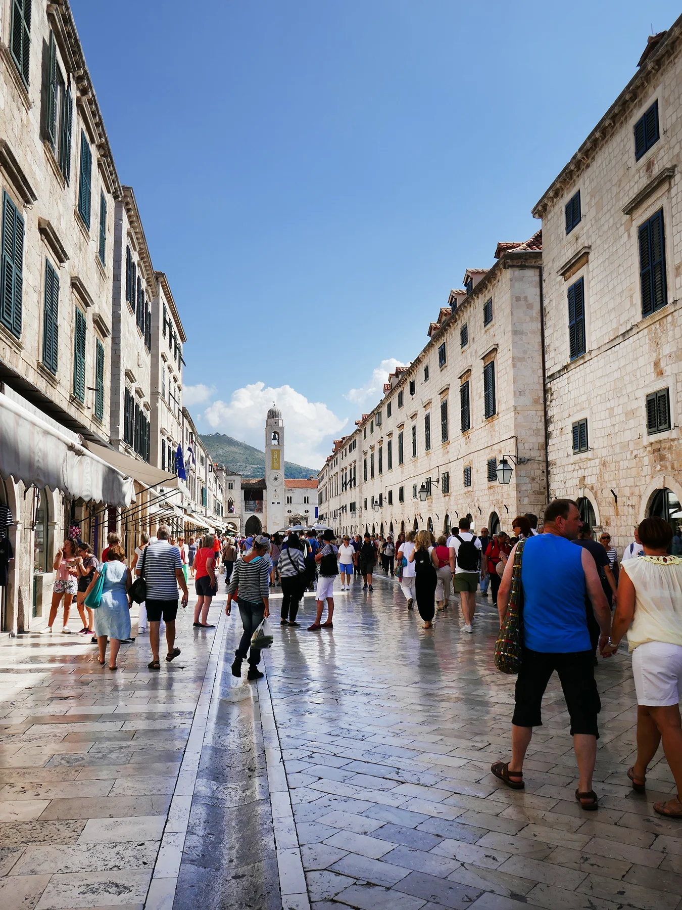 We walk down Dubrovnik’s main promenade — officially called the Placa, but better known as the Stradun. In the seventh century, this street was a canal. Romans lived on the island of Ragusa on the right side. The Slavs settled on the shore. In the 11th century, the canal separating Ragusa from the mainland was filled in. The towns merged, and a unique Slavic-Roman culture and language was born. For much of its history, Dubrovnik was forced to pay a hefty tribute to the sultan of the Ottoman Empire to maintain its independent status. Thus they hid their wealth and to avoid more taxes Dubrovnik down played its display of wealth in its buildings. They are all pretty plain.