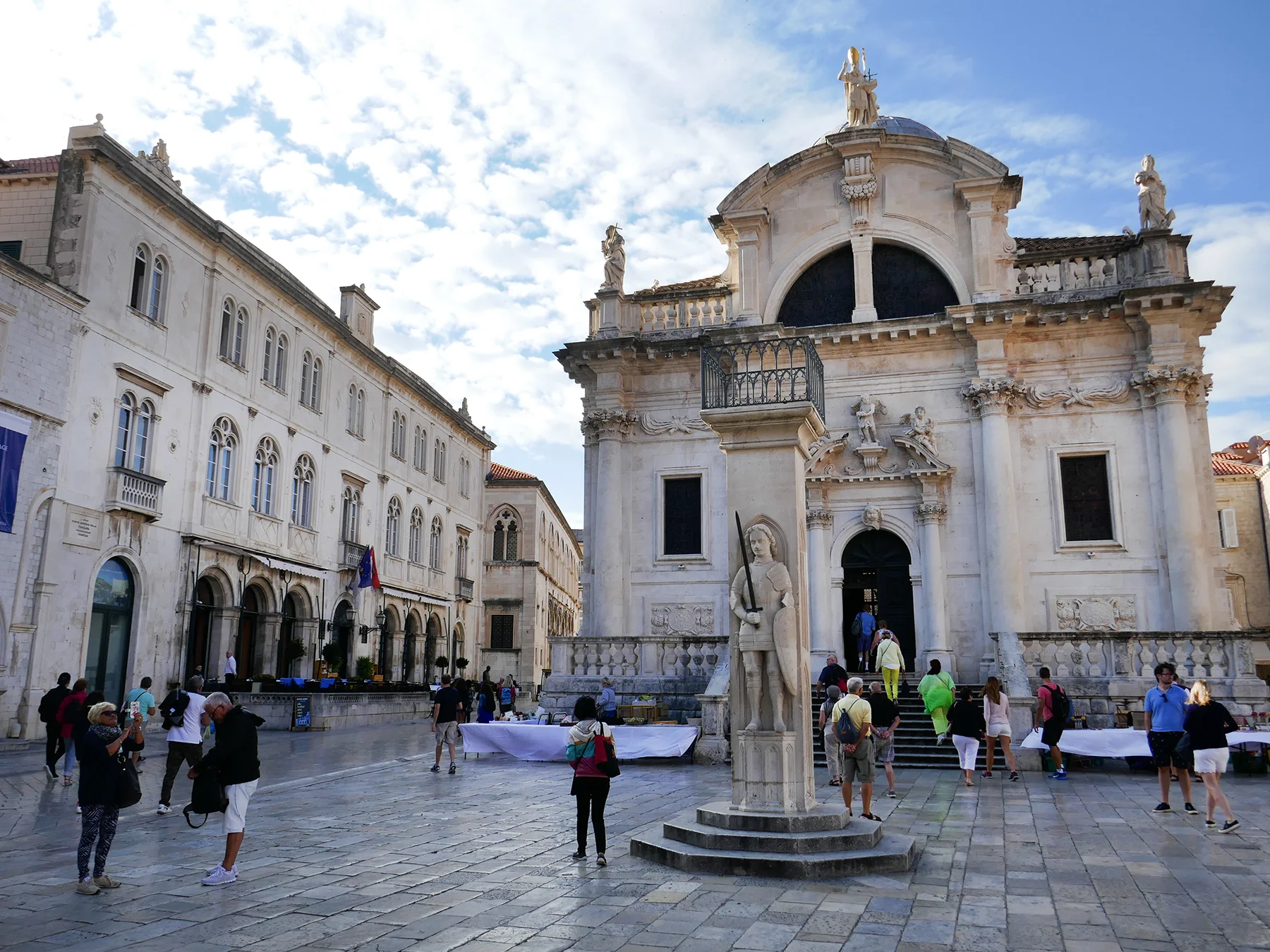 We stop at Orlando’s Column (Orlandov Stup). Dubrovnik erected the column in 1417, soon after it had shifted allegiances from the oppressive Venetians to the Hungarians. By putting a northern European symbol in the middle of its most prominent square, Dubrovnik distanced itself from Venice. Whenever a decision was made by the Republic, the town crier came to the column and announced the news. The step he stood on indicated the importance of his message. The higher up, the more important the news. It was also used to punish people publicly.