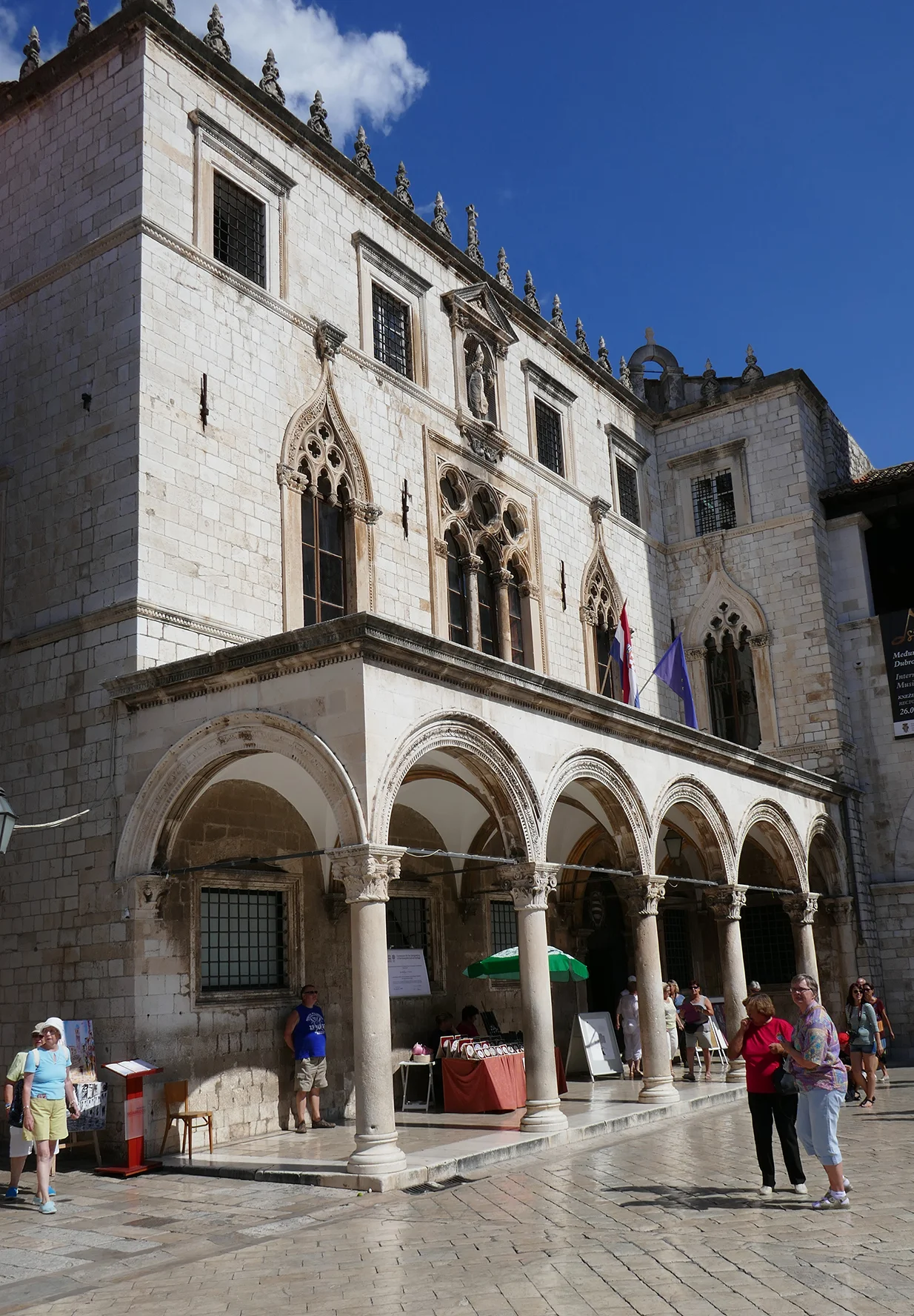 In front of us is the Sponza Palace (Sponza-Povijesni Arhiv). This building, from 1522, is the finest surviving example of Dubrovnik’s Golden Age in the 15th and 16th centuries.