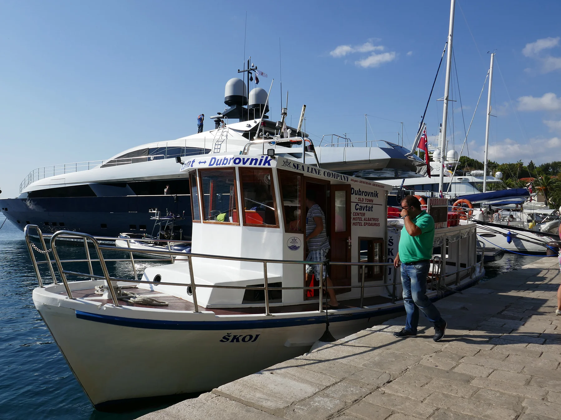 It takes about forty minutes before we pull up along the sea wall in Cavtat. There are two very large yachts backed into the small harbor.